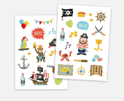 Mal einen Tag Pirat sein! Mit einem Papagei auf dem einen Arm und einem Piratenschiff auf dem anderen kann das Abenteuer beginnen. Die liebevoll gezeichneten Tattoos für die Kleinen sind ganz einfach anzubringen und auch wieder abzuwaschen. Das Set besteht aus 2 Bögen mit 2 verschiedenen Motiven.RR
