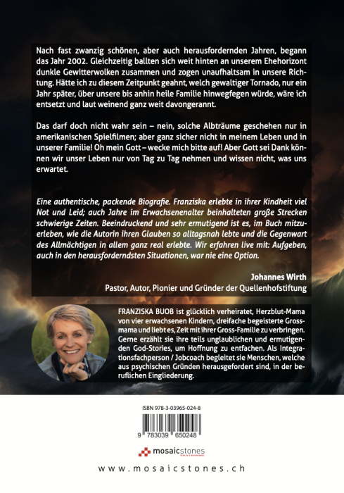 Nach fast zwanzig schönen, aber auch herausfordernden Jahren, begann das Jahr 2002. Gleichzeitig ballten sich weit hinten an unserem Ehehorizont dunkle Gewitterwolken zusammen und zogen unaufhaltsam in unsere Richtung. Hätte ich zu diesem Zeitpunkt geahnt, welch gewaltiger Tornado, nur ein Jahr später, über unsere bis anhin heile Familie hinwegfegen würde, wäre ich entsetzt und laut weinend ganz weit davongerannt.