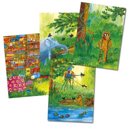 4 Faltkarten und Couverts mit Bildern aus dem Bilderbuch "Louis, lass uns ein Floss bauen!