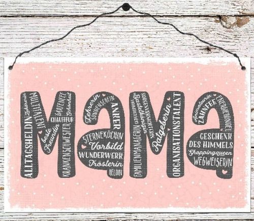 Ein hochwertiges Holzschild im Shabbystyle mit dem gewissen Etwas. Dieses Dekoschild im Vintage-Stil verleiht einem Zimm er einen besonderen Charakter. Ein Bibelvers oder Sinnspruch wird so zu einem echten Hingucker an der Wand. // Vollständ iger Text: Mama - Alltagsheldin, Zuhörerin, Multitalent, bes te Freundin, Chauffeur, Gartenfee, Schönheit, Krankenschwest er, Lehrerin, Sonnenschein, Anker, Sterneköchin, Vorbild, Wu nderwerk, Trösterin, Heldin, Familienmanagerin, Geduldsprofi nstalent, Animateurin, Zahnfee, Energiebündel, Geschenk des Himmels, Shoppingqueen, Wegweiserin.