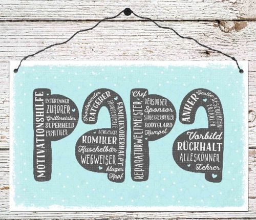 Ein hochwertiges Holzschild im Shabbystyle mit dem gewissen Etwas. Dieses Dekoschild im Vintage-Stil verleiht einem Zimm er einen besonderen Charakter. Ein Bibelvers oder Sinnspruch wird so zu einem echten Hingucker an der Wand. // Vollständ iger Text: Papa - Motivationshilfe, Entertainer, Zuhörer, Gr illmeister, Superheld, Ermutiger, Trostspender, Ratgeber, Sp ortexperte, Familienoberhaupt, Handwerker, Komiker, Kuschelb är, Wegweiser, kluger Kopf, Chef, Reparaturweltmeister, Vers Bastler, Geschichtenerzähler, Vorbild, Rückhalt, Alleskönner , Lehrer.