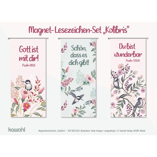 Die auf vollflächige Magnete gedruckten Lesezeichen haften s icher und gehen dabei schonend mit Buchseiten um. Jeweils dr ei zueinander passende Motive bilden ein hübsches Set und bi eten Abwechslung für den Lesealltag. / Text 1: Gott ist mit dir! Psalm 118,6 Text 2: Schön, dass es dich gibt! Text 3: Du bist wunderbar. Psalm 139,14