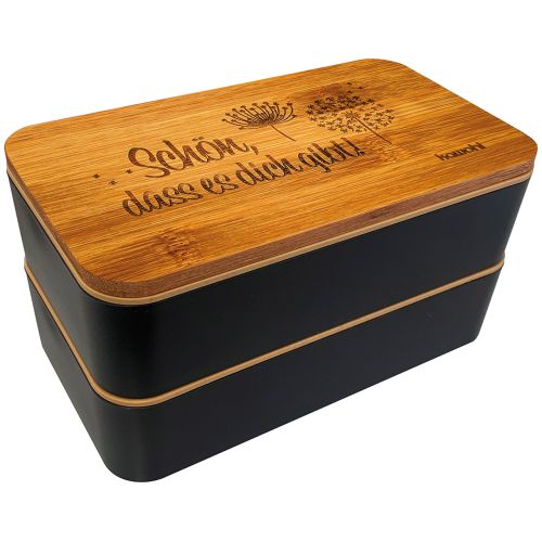 Mit dieser Lunchbox der Extra-Klasse haben Sie alles für die Mahlzeit unterwegs dabei. Sie besteht aus zwei separaten Do sen (à 600 ml) mit jeweils einem Deckel. Zusätzlich gibt es einen variablen Trenneinsatz sowie Messer, Gabel und Löffel, die zwischen den Etagen verstaut werden. Obenauf liegt noch ein Bambus-Schneidbrett mit dekorativem und ermutigendem De sign. Und zusammengehalten wird das Ganze von einem stabilen Gummiband. Boxen, Deckel und Besteck sind aus PP (Polypropy wohl zum Einfrieren im Gefriegerät als auch zum Erwärmen in der Mikrowelle geeignet. Das Brett ist nicht für die Mikrowe lle geeignet und nicht spülmaschinenfest, deshalb bitte manu ell reinigen und spülen.