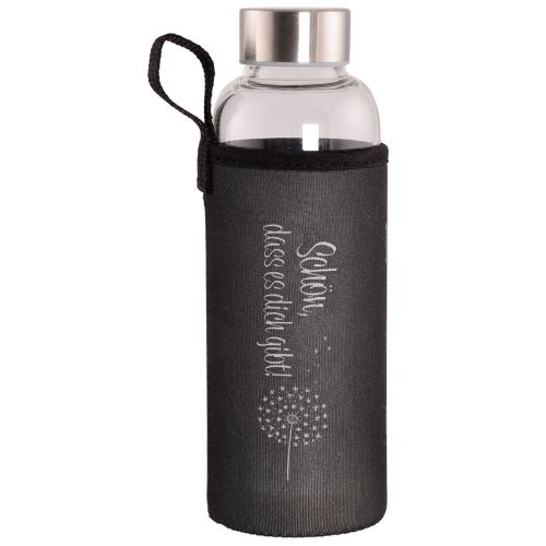 Die Trinkflasche aus hochwertigem Borosilikatglas und mit Ed elstahlverschluss eignet sich für sehr heiße und kalte Geträ nke. Der Thermoüberzug aus Neopren isoliert und schützt glei chzeitig. Die schwarze Hülle ist mit einem dekorativen Aufdr uck und einem passenden Motiv versehen.