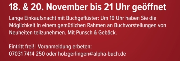 Anmeldung: telefonisch 07031 - 7414 250 oder per E-Mail an holzgerlingen@alpha-buch.de