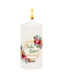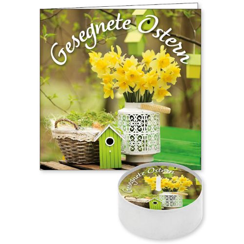 Ein kleiner Lichtgruß mit einer passenden Faltkarte (9 x 9 c m). Das Teelicht (Höhe 1,6 cm, Durchmesser 3,8 cm) ist auf b esondere Weise mit einer schwimmenden Botschaft veredelt. Be im Abbrennen schwimmt diese Botschaft auf dem flüssigen Wach s und bleibt so - bis auf ein kleines Loch um die Flamme her um - sichtbar. Botschaft: Gesegnete Ostern. Material: Paraff in. Brenndauer: ca. 3 Stunden.