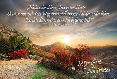 Behutsame und liebevolle Anteilnahme hilft durch die Zeit de s Abschiednehmens. Mit dieser Karte für persönliche Worte de s Mitgefühls zeigen Sie den Trauernden, dass Sie an sie denk en. Die sorgsam ausgewählte christliche Botschaft spendet Kr aft und Hoffnung. / Trauerfaltkarte mit Farbfoto-Motiv "In d en Bergen" und farblich passendem Umschlag. Hergestellt in D eutschland.