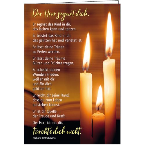 Vollständiger Text: Der Herr segnet dich. Er segnet das Kind in dir, das lachen kann und tanzen. Er tröstet das Kind in dir, das gelitten hat und verletzt ist. Er lässt deine Träne n zu Perlen werden. Er lässt deine Träume Blüten und Früchte tragen. Er schenkt deinen Wunden Frieden, weil er mit dir u nd für dich gelitten hat. Er reicht dir seine Hand, dass du zum Leben aufstehen kannst. Er ist die Quelle der Freude und Kraft. Der Herr ist mit dir. Fürchte dich nicht. / te, verbunden mit einer guten Botschaft, in liebevoller Gest altung. Jede Faltkarte enthält einen farblich passendem Ums chlag und zu einem bestimmten Anlass (außer Neutral) einen E inleger mit einem guten Wunsch oder Zuspruch. Hergestellt in Deutschland.