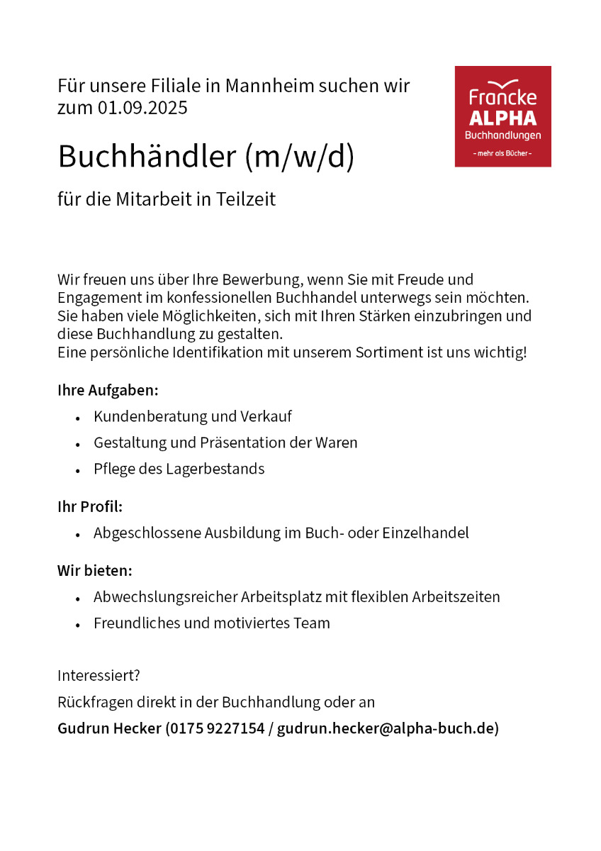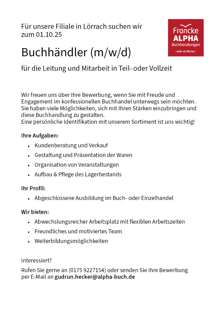 Sie haben Interesse an Büchern und Menschen und können sich vorstellen, in einer Buchhandlung zu arbeiten? Wir haben offene Stellen in ...