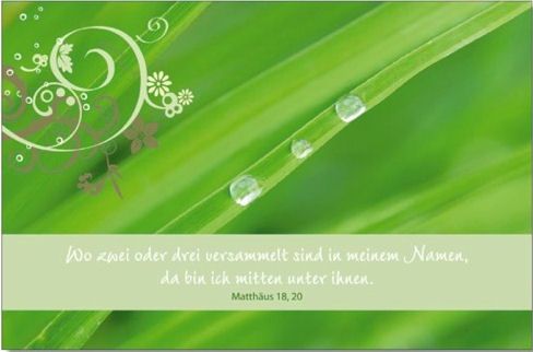Die passende Karte, für die besonderen Momente des Lebens. H ochwertige Faltkarte mit edlem, transparentem Umschlag. Mutm acher-Faltkarte mit mutmachendem Bibelvers, passendem kurzen erklärendem Text und ansprechender Natur-Fotografie. Text: Wo zwei oder drei versammelt sind in meinem Namen, da bin ich mitten unter ihnen. Matthäus 18,20